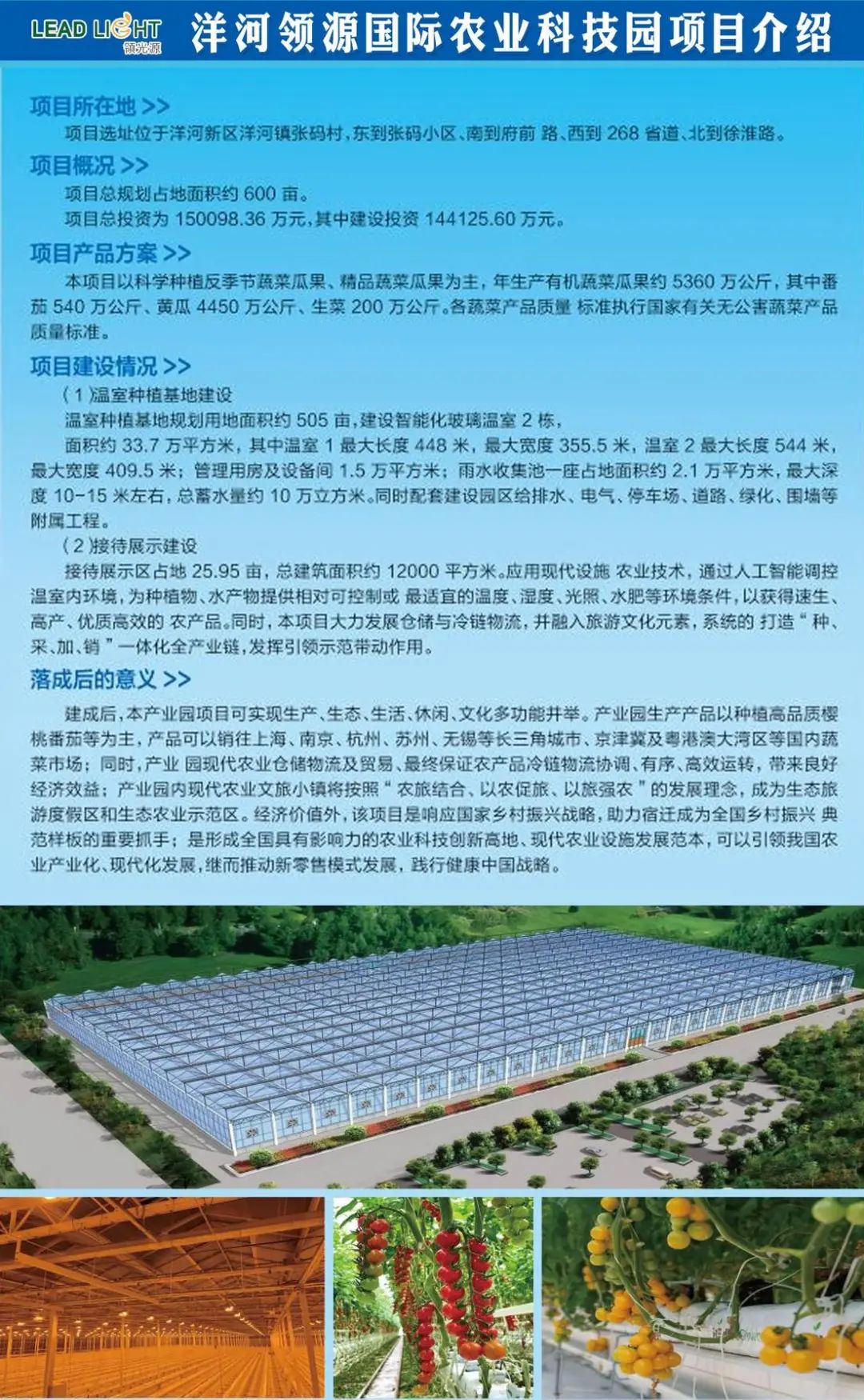 在开工典礼上,领光源(上海)农业科技发展有限公司董事长李臻峻发表致辞,他介绍说,洋河新区领源国际农业科技园是领源在江苏落地的第一个以现代设施农业为核心的项目,充分利用应用领光源所拥有的现代设施农业技术,通过人工智能调控温室内环境,以获得速生、高产、优质高效的番茄、叶菜、彩椒、黄瓜、花卉等农产品,同时,大力发展仓储与冷链物流,融入旅游文化元素,系统打造“种、采、加、销”一体化全产业链,发挥引领示范带动作用。